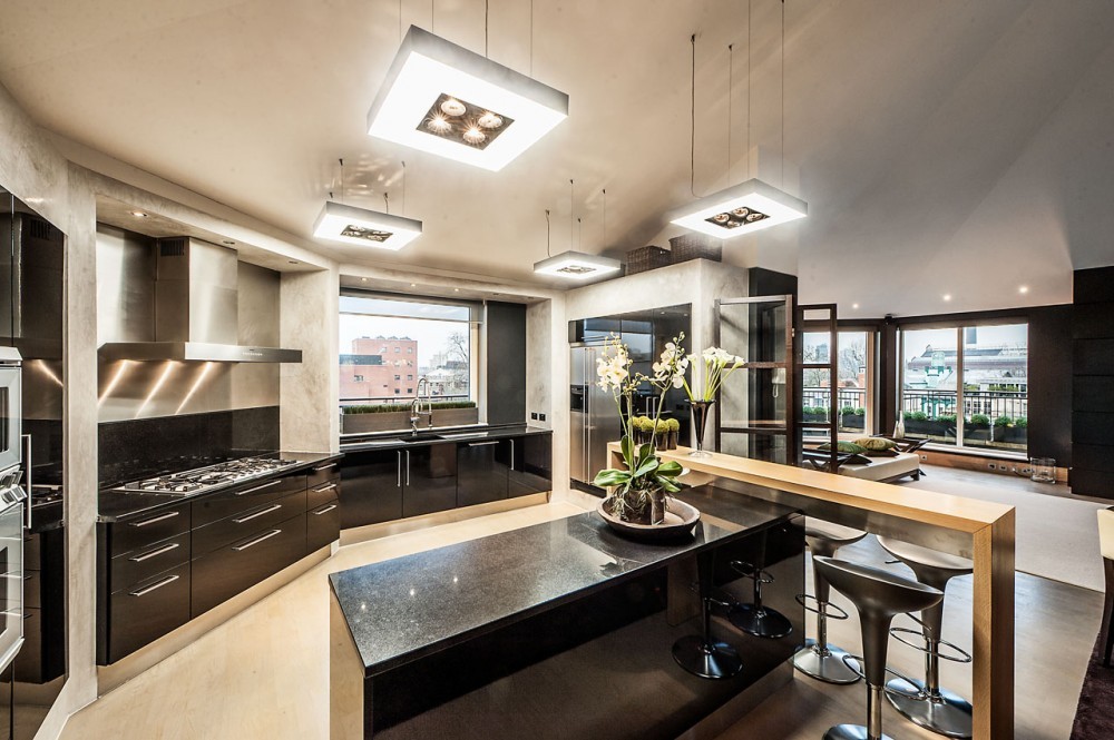 Spacious Living Areas: The penthouse boasts an elegant expansive reception room perfect for entertaining, an open plan kitchen and dining room, and a grand entrance hall with a modern sculptural spiral staircase.