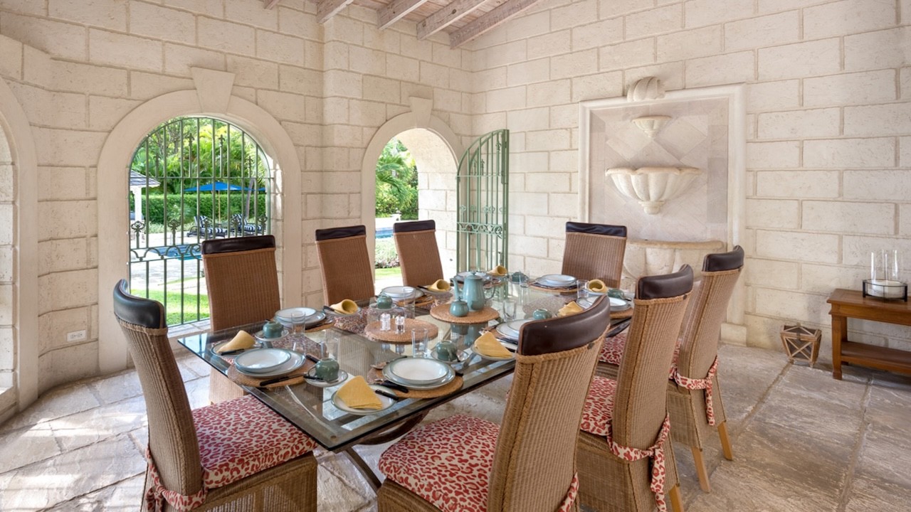 Grendon House is designed for elevated island living and effortless entertaining. The spacious outdoor areas invite relaxation beside the sparkling swimming pool, while the shaded gazebo offers an ideal setting for al fresco dining with friends and family. The patio overlooking the gardens offers a peaceful setting for outdoor relaxation.
