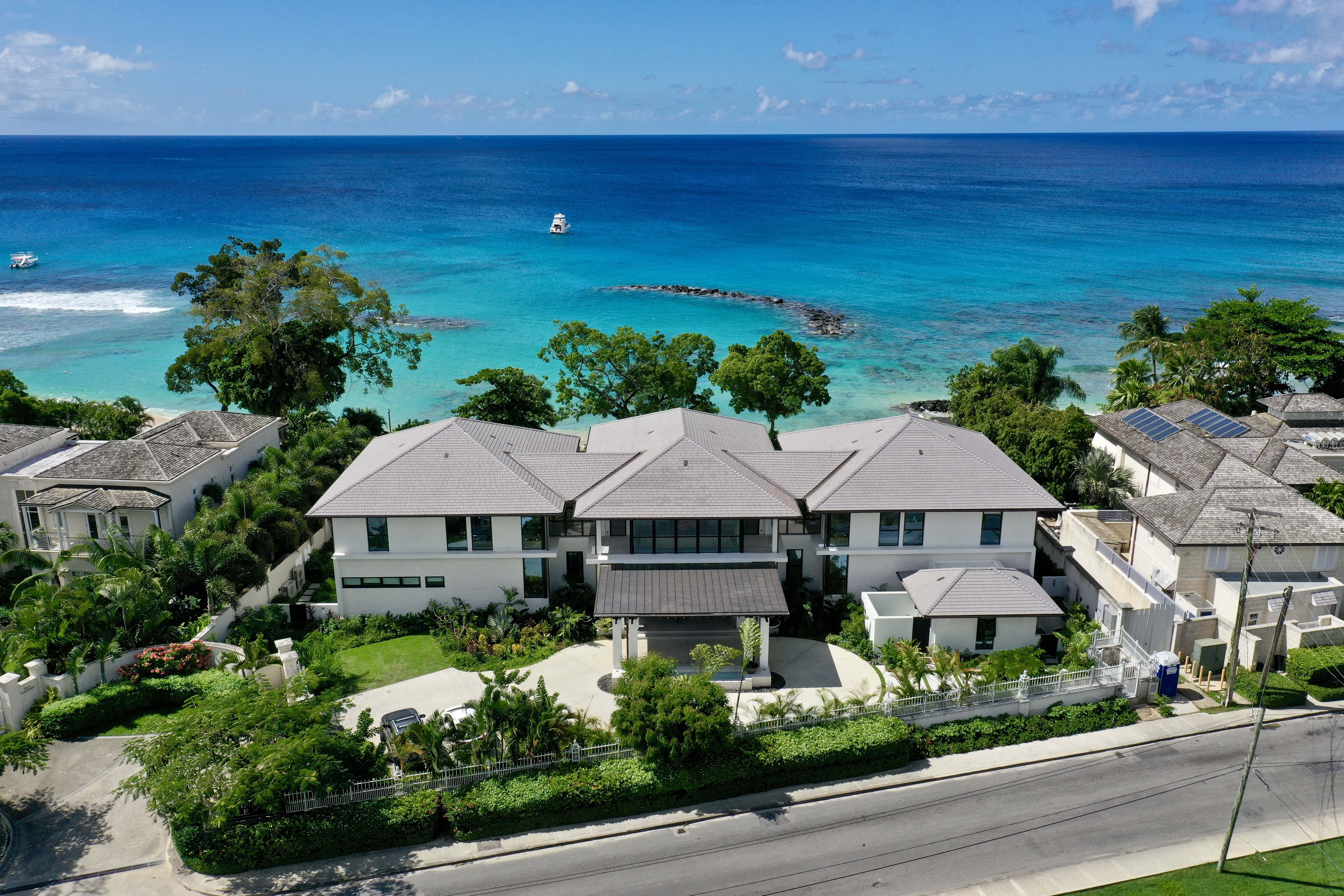 Nestled just a short walk away from Holetown on Barbados’ infamous West Coast of Barbados, this exquisite and vast 12,032 square feet, six bedroom home invites you to experience the ultimate beachfront escape. With its avant-garde architecture and stylish finishes, this exceptional property redefines the essence of modern living. Spanning two expansive floors, it boasts six sumptuous ocean-facing bedrooms, each with an en-suite bathroom, offering both privacy and unparalleled comfort.